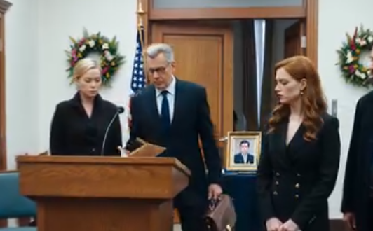 Han senket ikke farten. Bøyde ikke hodet. Han lot ikke engang som om han viste respekt. Han kom inn som om han var sen til en sommerbryllupsfest. Den marineblå dressen hans var perfekt skreddersydd, håret stylet, og på armen hadde han en yngre kvinne i en trang rød kjole, med et smil altfor selvsikkert for noen som sto foran en kiste.