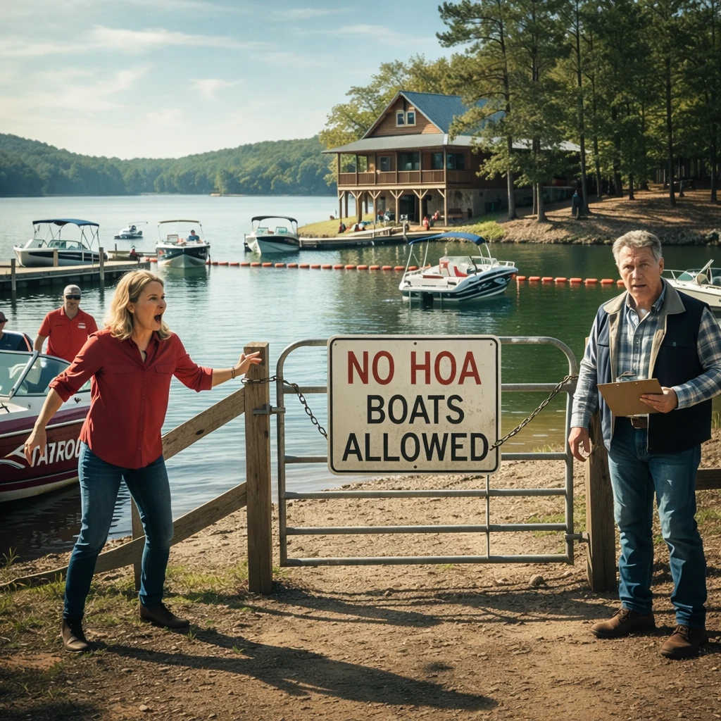 Karen stała przy dziobie w białej bluzce, szalik powiewał, okulary przeciwsłoneczne na głowie, ściskając zwinięty statut HOA, jakby to było prawo federalne. Za nią stało dwóch członków zarządu, z każdą sekundą mniej pewni.