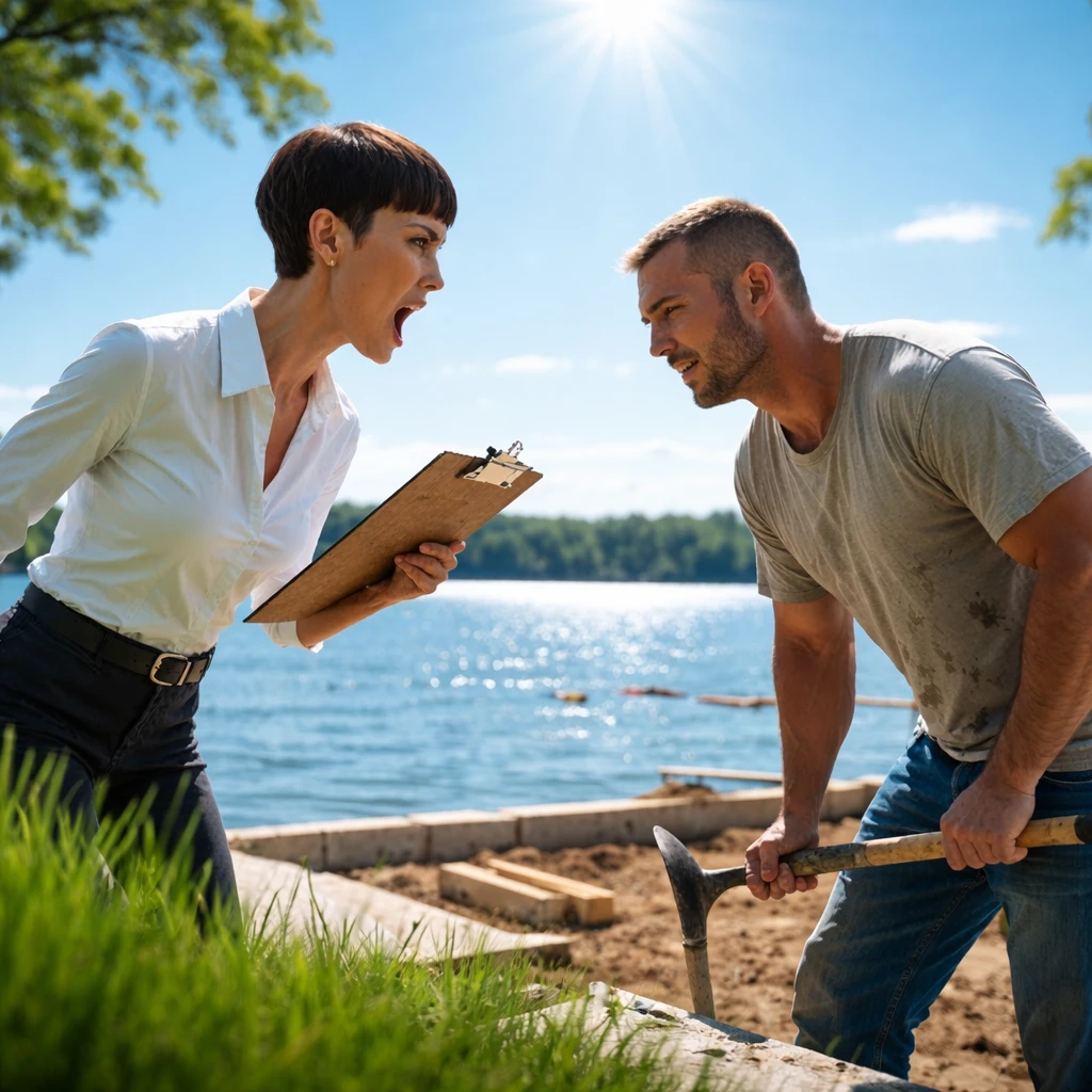 Dwa dni później, wracając z zakupów, znalazłem biały pickup zaparkowany przy jeziorze przy parkingu. Mężczyzna w khaki i neonowej kamizelce ratunkowej krążył wokół mojego muru oporowego z clipboardem, mrużąc oczy, jakby spodziewał się, że ukryta katastrofa się ujawni, jeśli wystarczająco mocno się skrzywi.
